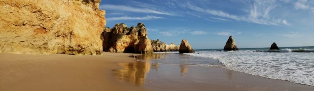 Localizada no canto esquerdo da praia de Alvor fica a praia Três Irmãos, com suas falésias, algares e 3 rochas em destaque, no mar.